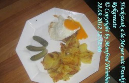 zutaten_2sp"> Zutaten für Personen Rezept mit Bild: Hackfleisch – Hacksteak a’la Meyer mit Frankforder Rohgreeste Bild einstellen 500 Gramm Rinderhackfleisch 5 Stk. Eier 1 Stk. Zwiebel 2 Stk. Knoblauchzehen [...]