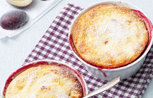 Quark-Grieß-Auflauf mit Pflaumen Zutaten 250 ml roter Traubensaft 50 g Rohrohrzucker 1 TL Zimt 3 TL Speisestärke 500 g TK-Pflaumen (halbiert) 2 Eier Salz 100 g Zucker 250 g Magerquark 80 g Weichweizengrieß 4 EL gemahlene Mandeln 2 TL Butter Fett für die Form Puderzucke [...]