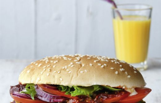 Feta-Hirse-Burger Zutaten 100 g Hirseflocken (aus dem Bioladen) 100 ml heiße Gemüsebrühe 1 kleine Möhre 2 kleine rote Zwiebeln 3 EL Öl 30 g Sonneblumenkerne 50 g Schafskäse (Feta) 1 Eiweiß 4 TL körniger Senf 2 EL Zucker 1/2 TL Currypulver Salz Pfeffer 40 g eingelegte Sil [...]