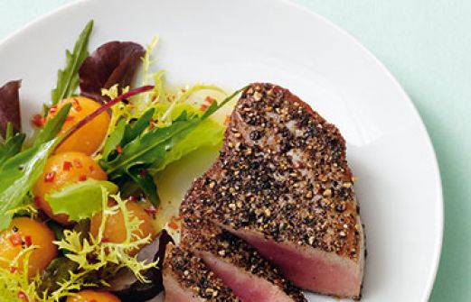 Pfeffer-Thunfisch mit Salat Zutaten 400 g TK-Bonito-Thunfischfilets 3 TL grob geschroteter schwarzer Pfeffer 4 EL Zitronensaft 3 TL flüssiger Honig Salz Pfeffer 6 EL Olivenöl 1 rote Chilischote 200 g gemischte Blattsalate (z. B. Rucola, Frisée, Romana) 500 g Charentais-Mel [...]