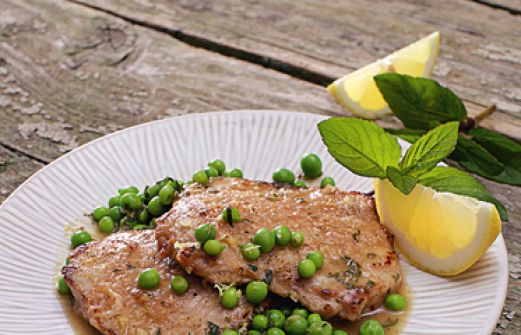 Kalbsschnitzel mit Minzerbsen Zutaten 750 g Erbsenschoten (oder etwa 300 g gepalte Erbsen, in dem Fall können sie auch tiefgekühlt sein) 1 kleines Bund Minze 1/2 Bio-Zitrone Salz 4 dünne Kalbsschnitzel (je etwa 150 g) Pfeffer 2 EL Mehl 50 g Butter 2 EL Olivenöl 200 ml tro [...]