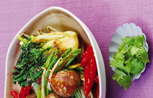 Hackfleischbällchen auf scharfem Gemüse Zutaten 1 Brötchen vom Vortag 1 kleine Zwiebel 1 Bund Koriandergrün (ersatzweise Petersilie) 400 g gemischtes Hackfleisch 1 Ei Salz Pfeffer 2 TL Sesamöl 200 g Thai-Spargel (Asienladen, ersatzweise grüner Spargel) 1 große rote Paprikasc [...]