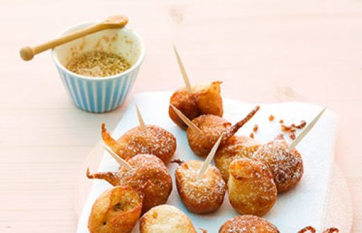 Bananen-Beignets mit Sesamhonig Zutaten 75 ml Milch 15 g Butter Salz 50 g Mehl 2 Eier (Größe S oder M) ca. ¼ l Öl zum Ausbacken 50 g flüssiger Honig 1 EL Sesamsamen 2 Bananen 1-2 TL Zitronensaft Puderzucker (nach Belieben) guk:similarity-keywords=""> 75 ml Milch , [...]