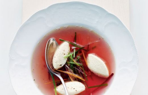 Wurzelgemüse-Bouillon mit Meerrettich-Quark-Nockerl Zutaten 120 g Magerquark 2 EL Meerrettich (aus dem Glas) 1 Eigelb 3 EL Mehl Salz Pfeffer 1 kleine Rote Bete 1 Möhre 1 Petersilienwurzel 1/2 Stange Lauch 750 ml kräftige Rinder-, Geflügel oder Gemüsebrühe guk:similar [...]