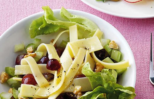 Käsesalat mit Trauben und Nüssen Zutaten 150 g Appenzeller (20 % Fett i.Tr.) 150 g Staudensellerie 100 g blaue Weintrauben Salz Pfeffer 1/2 TL mittelscharfer Senf 1 EL Weißweinessig 1 EL Sonnenblumenöl 1 EL Walnussöl 1 EL Walnusskerne einige Salatblätter für die Garnitur, z. [...]
