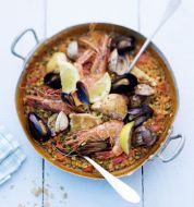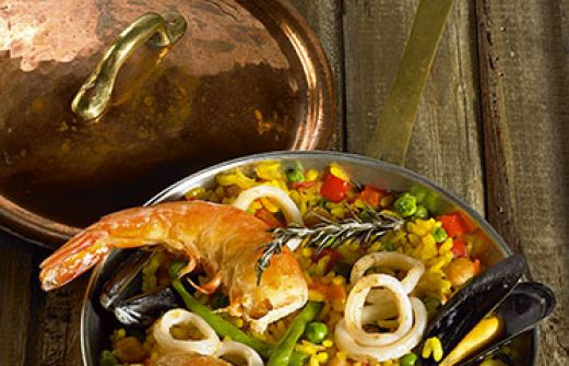 Paella mit Hähnchen und Meeresfrüchten Zutaten 500 g frische Miesmuscheln 8 große, küchenfertige Garnelen 150 g küchenfertige Tintenfischtuben 1 EL Zitronensaft 4 Hähnchenschenkel Salz Pfeffer Paprikapulver, edelsüß 150 g grüne Bohnen 2 rote Paprikaschoten 2 Tomaten 2 [...]