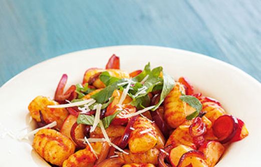 Rote Gnocchi-Pfanne Zutaten 2 rote Zwiebeln 1 Bund Radieschen 1 Radicchiosalat 2 EL Olivenöl 1 Knoblauchzehe 400 g Gnocchi (Kühlregal) 2 EL Tomatenmark Salz schwarzer Pfeffer aus der Mühle 50 g Parmesan, frisch gerieben guk:similarity-keywords=""> 2 rote Zwiebeln , [...]