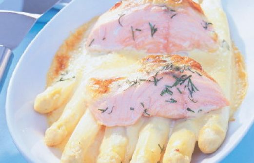Spargel-Lachs-Gratin Zutaten 5 kg weißer Spargel Salz Zucker 2 Eigelb 1 EL Vollmilchjoghurt 1 EL Weißwein 2 TL Senf 250 g erhitzte Butter Cayennepfeffer 4 Portionen Lachsfilet (á ca. 120 g, ohne Haut) Pfeffer 1/2 Bund Dill guk:similarity-keywords=""> 5 kg weißer S [...]