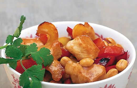 Huhn mit Paprika und Erdnüssen Zutaten 700 g Hähnchenbrustfilet 2 TL Speisestärke je 1 rote und gelbe Paprikaschote 6 getrocknete Chilischoten 5 EL Sojasauce 5 EL Reiswein 2 EL dunkler Reisessig 3 TL Zucker 5 EL Öl 125 g Erdnusskerne Salz Korianderblättchen zum Bestreuen g [...]