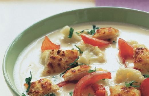 Blumenkohlsuppe mit Käsecroûtons Zutaten 1 Blumenkohl (1 kg) 3 Zwiebeln 30 g Butter Salz, Pfeffer, Muskat 1 1/4 l Brühe 200 ml Schlagsahne 250 g Tomaten 1/2 Bund Petersilie 4 Scheiben Toast 2 EL geraspelter Butterkäse guk:similarity-keywords=""> 1 Blumenkohl (1 kg) [...]