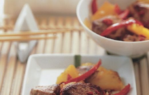 Schweinefleisch mit Paprika-Gemüse Zutaten 20 g Ingwer 2 rote Paprikaschoten 1 kleine Dose Ananasringe (580 ml) 4 Schweinenacken-Koteletts (600 g, ohne Knochen) 20 g Butterschmalz Salz Pfeffer 150 ml Brühe 2 EL Sojasauce 1 TL Speisestärke guk:similarity-keywords=""> [...]