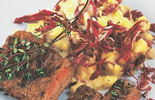 Rumpsteak mit Kartoffel-Radicchio-Püree Zutaten 1 kg Kartoffeln (vorwiegend festkochend) Salz 300 g Weichkäse mit Blauschimmel 50 g Salatblätter (z. B. Radicchio) 4 Rumpsteaks (á ca. 150 g) Pfeffer 1/2 Bund Thymian 2 EL Öl 2 EL Aceto Balsamico 200 ml heiße Milch guk:simi [...]