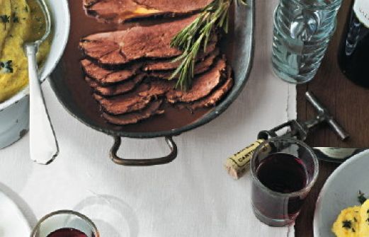 Rinderschmorbraten in Rotwein Zutaten 2 Zwiebeln 200 g Möhren 100 g Staudensellerie 2 Lorbeerblätter 4 Gewürznelken 1 Zimtstange 5 schwarze Pfefferkörner 1,5 kg Rinderschmorbraten (aus der Schulter) einige Stängel Petersilie und Thymian 1 Flasche Barolo (oder ein anderer t [...]