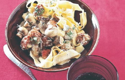 Pappardelle mit Fleischklößchen Zutaten 15 g getrocknete Steinpilze 3 grobe rohe Bratwürste (450 g) 3 EL Öl 400 g Pappardelle (breite Bandnudeln) Salz 300 g Champignons 1 Zwiebel Pfeffer 1 Becher Crème fraîche (150 g) 2-3 EL Soßenbinder 1 Bund Petersilie guk:similarity-k [...]