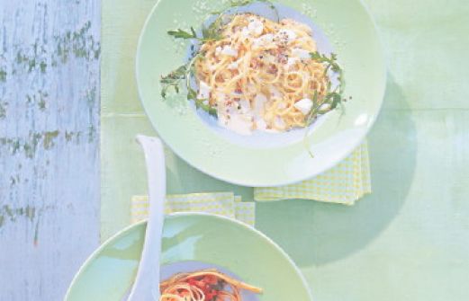 Spaghetti carbonara Zutaten 200 g Porchetta (italienischer Gewürzbraten, am Stück) 1 Zwiebel 400 g Spaghetti Salz 30 g Butter 200 g Sahne 100 g Ziegenfrischkäse 50 g Rucola 2 Eier 2 Eigelb Pfeffer 50 g frisch geriebener Parmesankäse guk:similarity-keywords=""> [...]
