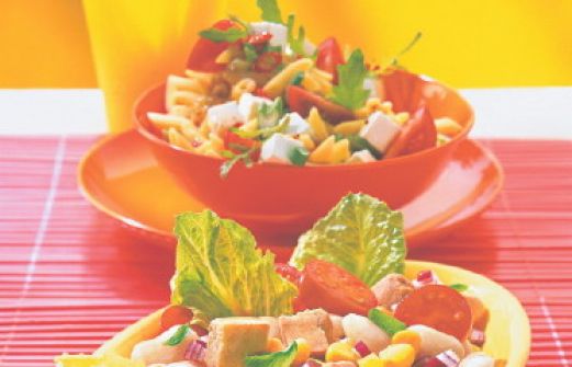 Nudelsalat mit Rucola und Feta Zutaten 250 g Nudeln (z. B. Penne) Salz 75 g Rucola 250 g kleine Strauchtomaten 1 Bund Lauchzwiebeln 250 g Feta 7 EL Olivenöl 3-4 EL Aceto Balsamico bianco 1 EL Honig 1 EL Dijon-Senfcreme 1/2 TL Paprikapulver 1/2 TL Curry 1 EL süß-scharfe Chi [...]