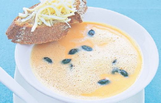 Möhrensuppe mit Kürbiskern-Pesto Zutaten 500 g Möhren 200 g Kartoffeln 20 g Butter Salz Pfeffer 100 ml Weißwein 1,2 l Brühe 40 g Kürbiskerne 1 Bund glatte Petersilie 3 EL Öl 8 Scheiben Roggen-Baguette 80 g geraspelter Käse (z. B. Pizzakäse) 100 g Sahne guk:similari [...]