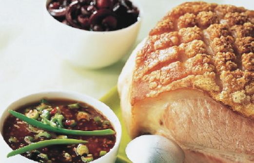 Gebackener Schinken mit Dips Zutaten ca. 3 kg leicht gepökelter Schweineschinken mit Schwarte (vorbestellen, Schwarte einritzen lassen) 2 rote Zwiebeln 10 g Butter 300 g Cranberries (frisch oder tiefgefroren) 100 g Zucker je 1/8 l Rotwein und Gemüsebrühe 200 ml Pflaumensoße (Asi [...]