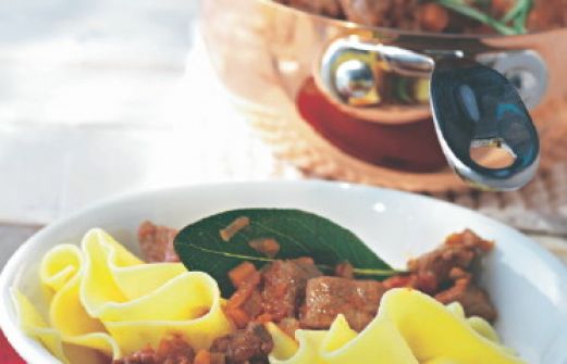 Pappardelle mit Lammragout Zutaten 700 g Lammschulter (ohne Knochen) 200 g Möhren 2 Stangen Staudensellerie 2 Zwiebeln 4 EL Olivenöl 20 g Butter Salz Pfeffer 2 EL Tomatenmark 500 g Tomatenstückchen (Dose) 1/4 l Rotwein 1 Zweig Rosmarin 1 Gewürznelke 1 Lorbeerblatt 40 [...]