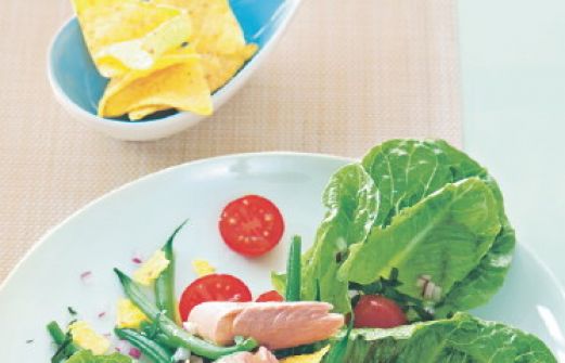 Thunfisch-Bohnen-Salat Zutaten 500 g grüne Bohnen Salz 1 Bund glatte Petersilie 1 rote Zwiebel 3 EL Essig 4 EL Gemüsebrühe 1 TL Senf Pfeffer Zucker 4 EL Olivenöl 2 Dosen Thunfischfilets ohne Öl (á 185 g Füllmenge) 250 g Tomaten 2 Mini-Römersalate 20 g Tortilla-Chips [...]