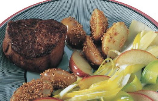Filet mit Porree Zutaten 600 g Schweine- oder Rinderfilet 3 Stangen Porree (500 g) 2 Äpfel (300 g) 30 g Butter oder Margarine 1 Gemüsefond 100 ml Schlagsahne Pfeffer 2 Esslöffel Öl 1 Ecke Sahneschmelzkäse (62,5 g) Salz Curry 1-2 Esslöffel Soßenbinder guk:similarity-keyw [...]
