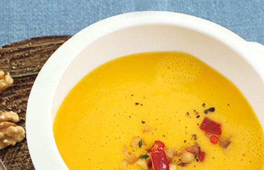 Kürbissüppchen mit Apfel und Walnuss Zutaten 700 g Hokkaidokürbis 1 kleine Zwiebel 1 mehligkochende Kartoffel 1 Möhre 1 kleine Pastinake 1 walnussgroßes Stück frischer Ingwer 1 Zweig Rosmarin 1/2 frische Chilischote 2 TL neutrales Pflanzenöl Salz 1 Lorbeerblatt 600 ml K [...]
