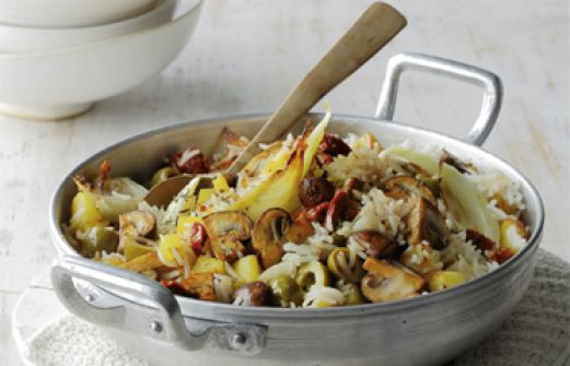 Reispfanne mit Pilzen Zutaten 1 Fenchelknolle (ca. 250 g) 300 g Champignons oder Egerlinge 250 g festkochende Kartoffeln 80 g grüne oder schwarze Oliven (ohne Stein) 80 g getrocknete Tomaten (in Öl) 2 EL Butterschmalz 2 TL getrockneter Thymian 500 g gekochter Reis (vom Vortag [...]
