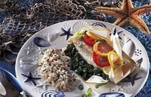 Menge Zutat 600 g Alaska-Seelachs 250 g Blattspinat 250 g Tomaten 1 St Zitrone (unbehandelt) Pergamentpapier 1 TL Majoran [...]
