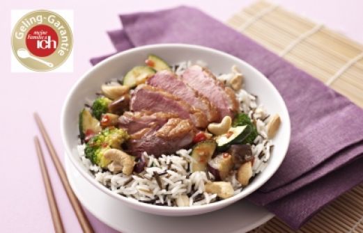Menge Zutat 600 g Brokkoli etwas Salz 100 g Cashewnusskerne 2 kleine Zucchini 2 Entenbrustfilets (Ã ca. 350 g) etwas Pfeffer [...]