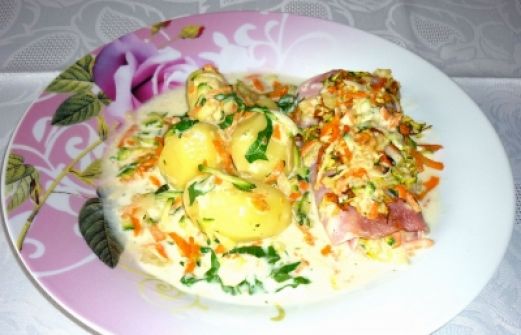 Menge Zutat 200 g Möhren 200 g Zucchini 1 St Kl. Kohlrabi 8 Schb Kochschinken 250 ml Süsse Sahne 250 ml Wasser [...]