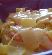 Menge Zutat 500 g Hähnchenbrust 400 g gelbe und/oder rote Paprika 200 g Karotten 1/2 l Kokosmilch wenig Safran- und Kurkumapulver [...]