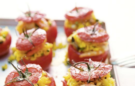 Gefüllte Tomaten Zutaten 800 g Miesmuscheln 100 g TK-Erbsen 7-8 EL Olivenöl 300 ml Weißwein 1 Hänchenbrustfilet 12 kleine Crevetten ohne Schale Salz Cayennepfeffer 2 Schalotten 2 Knoblauchzehen 200 g Paellareis 1 TL Safranfäden 250 ml Geflügelbrühe 8 Fleischtomaten P [...]