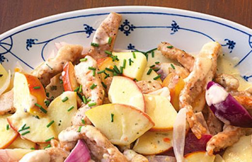 Geschnetzeltes mit Äpfeln Zutaten 1 Schweineschnitzel (ca. 125 g) Salz Pfeffer 1 TL Mehl 1 rote Zwiebel 1 Apfel (z. B. Boskop) 1 EL frisch gepresster Zitronensaft 1 ½ EL Butterschmalz 50 g Sahne 50 ml Gemüsebrühe 2 EL Calvados (franz. Apfelschnaps, ersatzweise Sherry) ¼ [...]