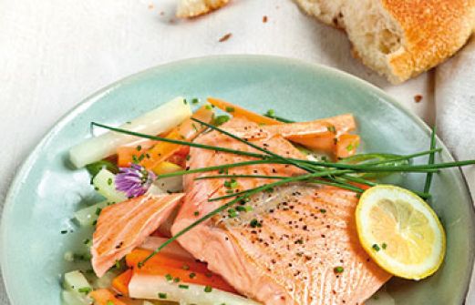 Lachs mit Schnittlauchgemüse Zutaten 1 Bund Möhren 1 Bund Frühlingszwiebeln 1 Kohlrabi 300 g Lachsfilet (frisch oder TK) 2 EL Zitronensaft Salz Pfeffer 20 g Butter 2 TL Mehl 3 EL Schnittlauchröllchen 2 Brötchen (je ca. 50 g) guk:similarity-keywords=""> 1 Bund Mö [...]