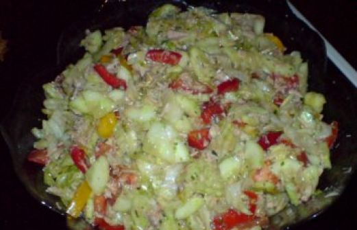 Zutaten für Personen Rezept mit Bild: Bunter Partysalat mit Thunfisch Bild einstellen 1 Kopf Eisbergsalat 1 Zwiebel fein würfeln 2 Paprika, gelb und rot 2 grüne Gurken 7 Tomaten [...]