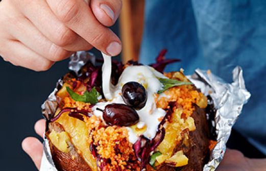 Couscous-Kraut-Kumpir Zutaten 4 große mehligkochende Kartoffeln (je ca. 300 g) 2 EL Sonnenblumenöl Salz 400 g Rotkohl 1 EL Zucker Salz 3 EL Zitronensaft 6 EL Olivenöl 100 g Instant-Couscous 1 TL Harissa (Chiliwürzpaste) 1 EL Tomatenmark 200 ml Orangensaft 4 EL Crème fraîche [...]