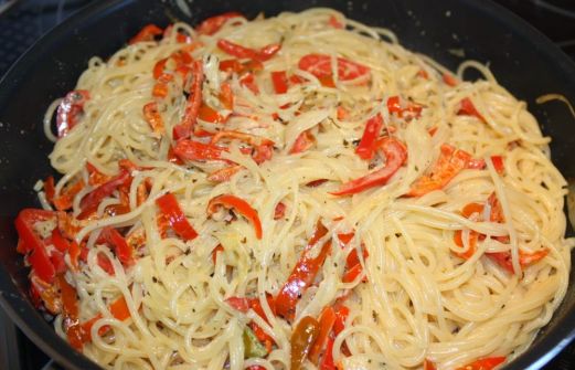 Die Paprika und die Zwiebel in Streifen schneiden. Die Zwiebelstreifen in einer Pfanne mit Olivenöl glasig dü [...]
