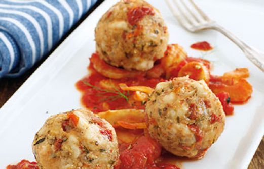 Pizzaknödel mit Fenchel-Tomatensauce Zutaten 200 g Weißbrot oder Brötchen 150 ml Sojamilch 3 EL Hefeflocken 1 EL Sojamehl Salz 6 Zweige mediterrane Kräuter (Rosmarin, Salbei, Thymian; ersatzweise je 1 TL getrockneter Thymian und Rosmarin) 200 g Räuchertofu 150 g getrocknete Tomat [...]