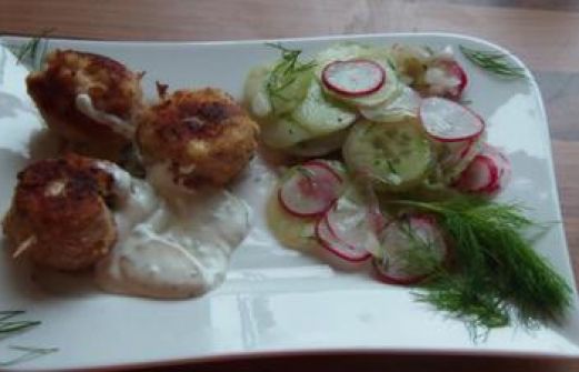 Zutaten für Personen Rezept mit Bild: Putenröllchen Bild einstellen 1 Salatgurke 1 Bd. Radieschen 0.5 Bd. Dill 1 kleine Zwiebel 3 Eßl. Essig Salz,Pfeffer,Zucker 5 Eßl. Öl 2 Scheiben Putenbr [...]