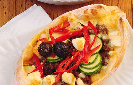Pide mit Hackfleisch und Oliven Zutaten 1 Packung Pizzateig (400 g; Kühlregal) 1 rote Spitzpaprika 1 kleiner Zucchino (ca. 150 g) 1 EL Öl 200 g Rinderhackfleisch 1 Knoblauchzehe Salz Pfeffer je ca. 1 TL edelsüßes Paprikapulver und gemahlener Kreuzkümmel 100 g Schafkäse (Fet [...]
