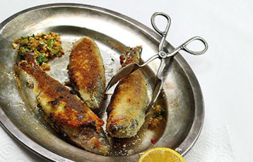Gebackene Sardinen Zutaten 3 EL Rosinen 2 EL Sherry medium 3 EL Pinienkerne 1 EL gehackte Petersilie Salz Pfeffer 12 frische Sardinen (je ca. 40 g) 3 EL Mehl 1 Ei 4 EL Semmelbrösel zum Panieren Olivenöl zum Braten 1 Knoblauchzehe Zitronenschnitze zum Garnieren guk: [...]