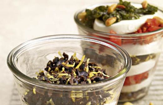 Caprese mit Pesto und Zitronat Zutaten 4 Tomaten 4 getrocknete Tomaten Salz Pfeffer 50 g schwarze, entsteinte Oliven 1/2 Bio-Zitrone 1-2 TL Aceto balsamico 1 TL Zitronat 50 g Pesto (Fertigprodukt) 2 EL Pinienkerne 200 g Büffel-Mozzarella (1-2 Kugeln) guk:similarity-keyw [...]