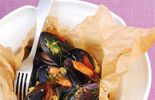 Muscheln im Papier Zutaten 1 kg Miesmuscheln 1 Handvoll Kaffir-Limettenblätter (aus dem Asienladen) 3 Stängel Zitronengras Saft und abgeriebene Schale von 1 Bio-Limette 1 Stück frischer Ingwer (ca. 4 cm) 2 kleine frische rote Chilischoten 1 Eiweiß 1,5 m Backpapier guk:similar [...]