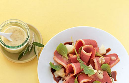 Entenbrust-Carpaccio mit Melonen-Vinaigrette Zutaten 2 EL Olivenöl 2 EL Balsamico-Essig 100 g Honigmelone 6 Salbeiblätter Salz schwarzer Pfeffer 1 Handvoll Rucola 200 g geräucherte Entenbrustscheiben guk:similarity-keywords=""> 2 EL Olivenöl , 2 EL Balsamico-Essig , [...]