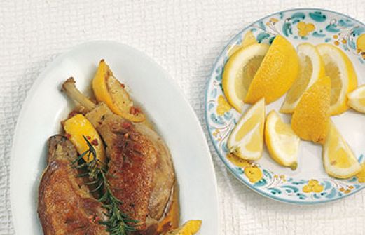 Entenkeulen in pikanter Sauce Zutaten 4 Entenkeulen (je 350 g) Salz Pfeffer, frisch gemahlen 30 g geräucherter Bauchspeck 4 Knoblauchzehen 1 unbehandelte Zitrone 8 Salbeiblätter 2 Zweige Rosmarin 4 EL Olivenöl 4 Anchovisfilets (abgetropft) 300 ml Hühnerbrühe guk:simila [...]