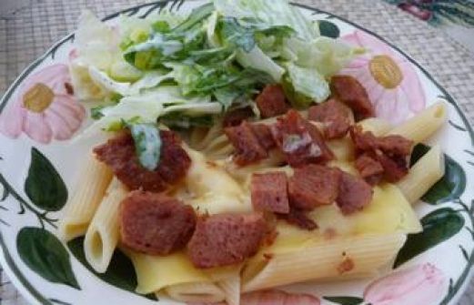 Zutaten für Personen Rezept mit Bild: Unter 30 Minuten : Penne mit gebratener Wurst und Scheibenkäse und Salat Bild einstellen 200 gr. Penne gekocht 300 gr. Geflügelfleischwurst 2 Scheiben Käse nach Wahl [...]