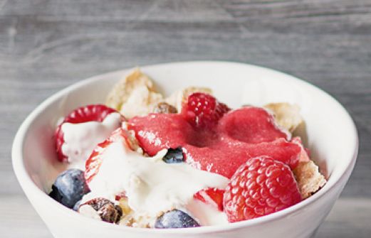 Beeren-Knusper-Müsli Zutaten 4 EL kernige Vollkorn-Haferflocken 3 EL Vollkorn-Dinkelflakes (ungesüßt) 1 EL gehackte Walnüsse 1 EL Sonneblumenkerne 1 EL Rosinen 250 g gemischte Beeren (z.B. Erdbeeren, Heidelbeeren, Himbeeren) 1/2 Orange 300 g Naturjoghurt 3 TL Himbeerfruchtaufs [...]