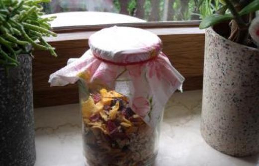 Zutaten für Personen Bild einstellen 150 g zarte Haferflocken 100 g kernige Haferflocken 50 g Cornflakes 50 g gehackte Haselnüsse oder Mandeln 50 g gehackte Walnüsse 50 g getrocknete Aprikosen 50 g getrocknete Backpf [...]