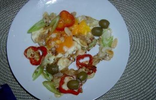 Zutaten für Personen Bild einstellen 1 Stück Eier Freiland 20 g Paprika rot scheibenförmig geschnitten 20 g Staudensellerie geschnitten 5 Stück Oliven grün gesäuert [salzig] 1 EL Olivenöl 1 EL Mandeln gehobelt 1 Prise [...]