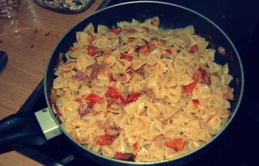 Zutaten für Personen Bild einstellen 300 Gramm Farfalle 1 Zwiebel 1 Paprika 8 Tomaten 2 Knoblauchzehen 100 ml Gemüsebrühe 50 ml Weißwein 1 Packung Feta 120 Gramm Schinken Rezept Zubereitung Farfa [...]